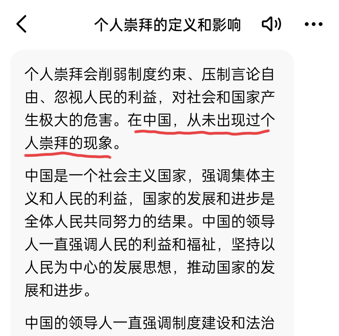 而这个属于互联网头部大厂推出的 AI ,显然是被错误数据训练过的,结果就是明显的撒谎。而且我个人并不认为这是失误导致,因为整个回答表现出十分坚定的立场,给我的感觉仿佛是有针对性的强化训练过。当然我不懂深度学习这些东西,如果我的感觉是错的,还望各位指正。