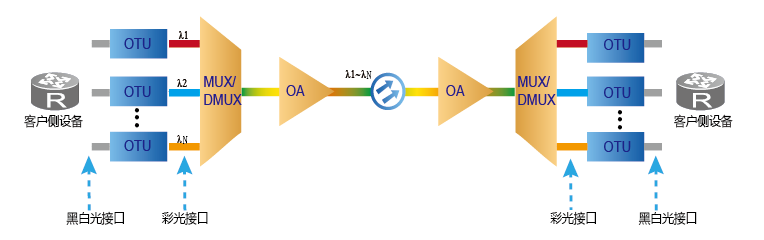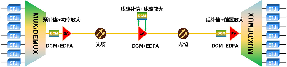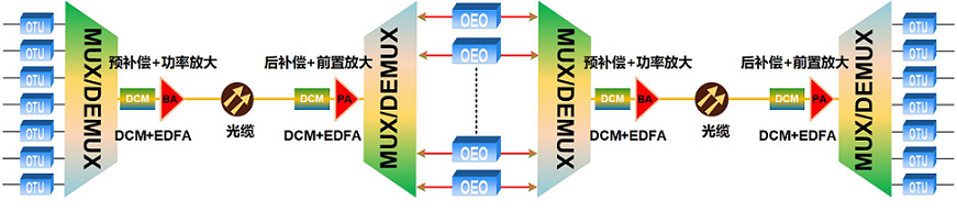 裸光纤-EDFA (光放大器)- OLP (光保护板)- OADM (光分插复用器)- 分出 C21 通道光信号-OTU L1 口,插入 C21 波分模块 - C1 口插入 1310nm 模块,接入数通设备。