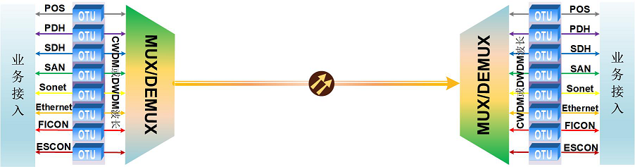 OTU 首先把符合 G.957 规范的复用光通路信号进行光/电( O/E )转换,然后把转换后的电信号进行整形、定时提取和数据再生(也可不进行数据再生),最后再进行电/光( E/O )转换,输出波长、色散和发光功率等皆符合 G.692 规范要求的 DWDM 复用光通路信号。 如果 O/E 转换后,只进行整形、定时处理(即 2R 功能,Reshaping, Retiming ),该 OTU 只实现波长转换的功能,传输距离较短。如果 O/E 转换后,进行了整形、定时、再生处理(即 3R 功能,Reshaping , Retiming , Regeneration ),该 OTU 实际上兼有再生中继器( REG )的功能。 根据在波分( WDM )系统中位置不同而分为:发送端 OTU ,作为再生中继器的 OTU ,接收端的 OTU 。再生中继器的 OTU 除执行光/电/光转换,实现整形、定时、再生处理(即 3R 功能,Reshaping , Retiming , Regeneration )功能外,还需要对某些再生段开销字节进行监视的功能,如再生段误码 B1 字节的监测等。