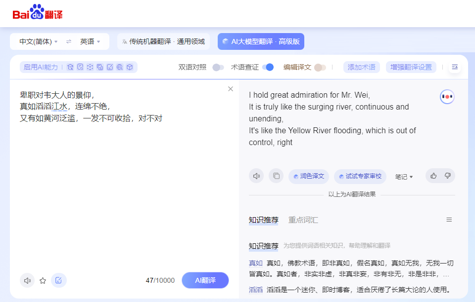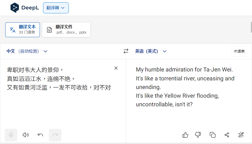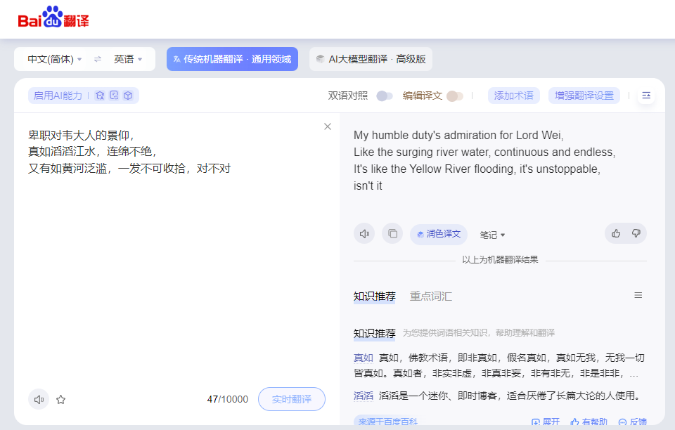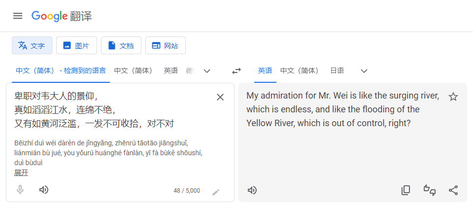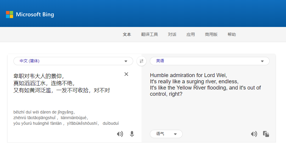 翻译结果的第一行就错了,卑职的景仰 译成了 Humble admiration(卑微的景仰),